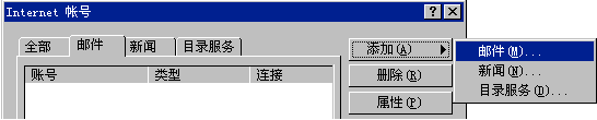 單擊"添加"按鈕,從彈出的菜單中選擇"郵件"選項將彈出Internet連接向導;